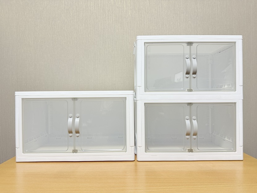 『ジョイントできる扉付折りたたみ収納ケース』は機能性にも優れていて、複数重ねてジョイントもできる。完成済みの収納ケースの天板を外し、その上にもう1つの収納ケースを重ね、