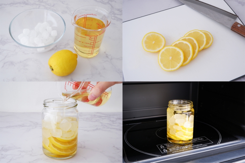 今回はキウイ酢を作ってみましたが、筆者の冷蔵庫にはいつも「レモン酢」が入っています。レモン酢も作り方は同じです。保存瓶に、輪切りにしたレモン・氷砂糖・酢を入れ、電子レンジで30秒(600w)加熱するだけ。レモン酢もキウイ酢も、作った翌日には飲むことができます。