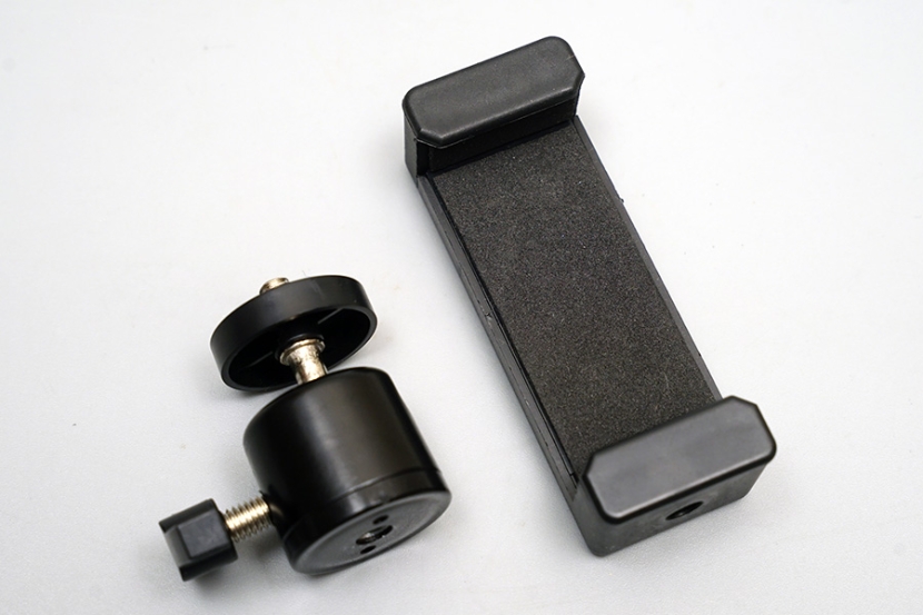 しかも、カメラなどの装着角度を調整するためのミニ雲台と、スマートフォンを縦横それぞれの位置で固定できる「スマートフォンホルダー」も付属します。どちらも筆者がネットストアなどで見たことのある、もっとも安いレベルの商品によく似ていますが、税込770円のライトスタンドの付属品としては非常に豪華です。