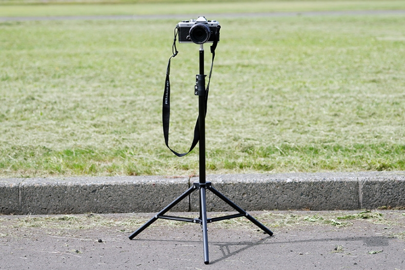 レンズの交換式のカメラを固定するには、強度的に不安がありますが、中大型のストロボやLEDライトを乗せることもあるので、スマートフォンやコンパクトカメラを固定するには十分な強度があります。倒れやすいため、三脚というよりは自立式一脚と呼ぶのは、絶妙なネーミングセンスと呼べるでしょう。まさに発想の転換。