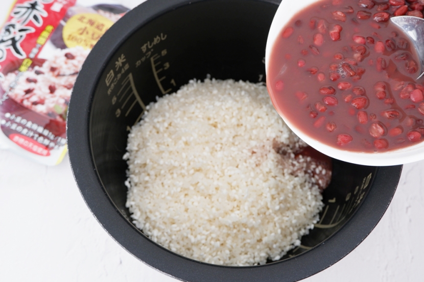 炊飯器に水切りした白米・もち米と『お赤飯の素 3合炊き』の中身を煮汁ごとすべて入れましょう。