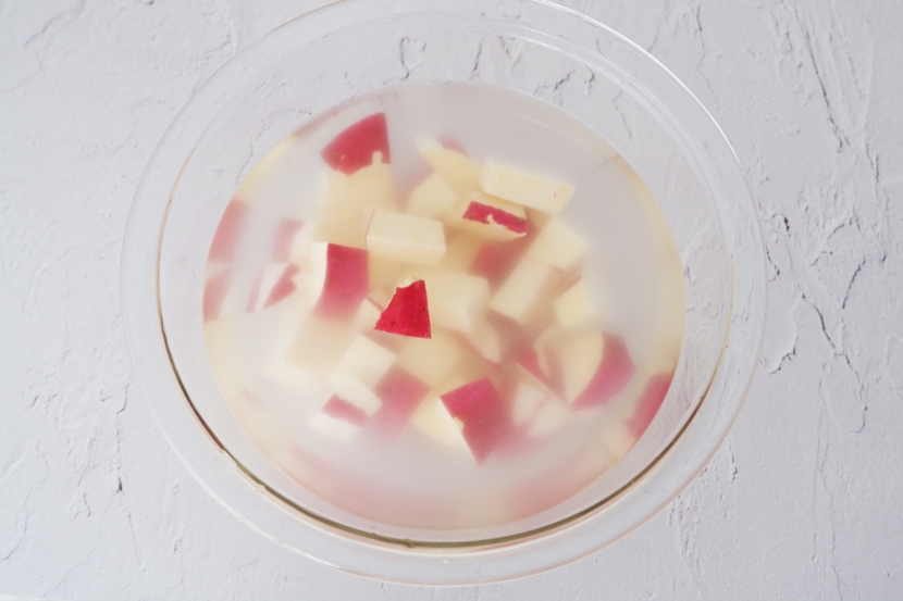まずはよく水洗いしたさつまいもを、皮つきのままカットして水に浸けます。ゴロッとした存在感になるように、やや大きめにカットしてみました。水に浸けるのは5分程度で大丈夫です。