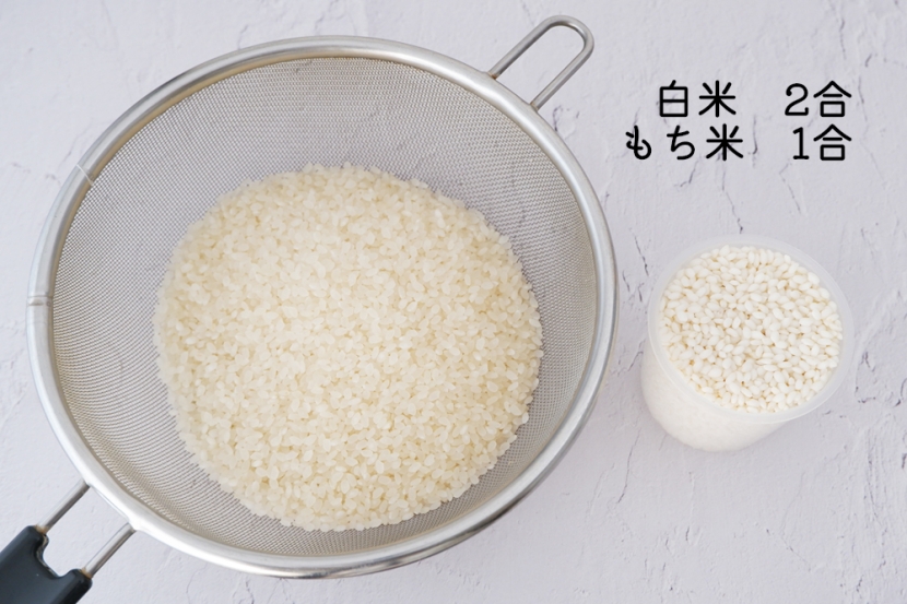 今回は白米2合ともち米1合のブレンドで炊いていきましょう。いつも通りにお米を研いで水切りをしておきます。