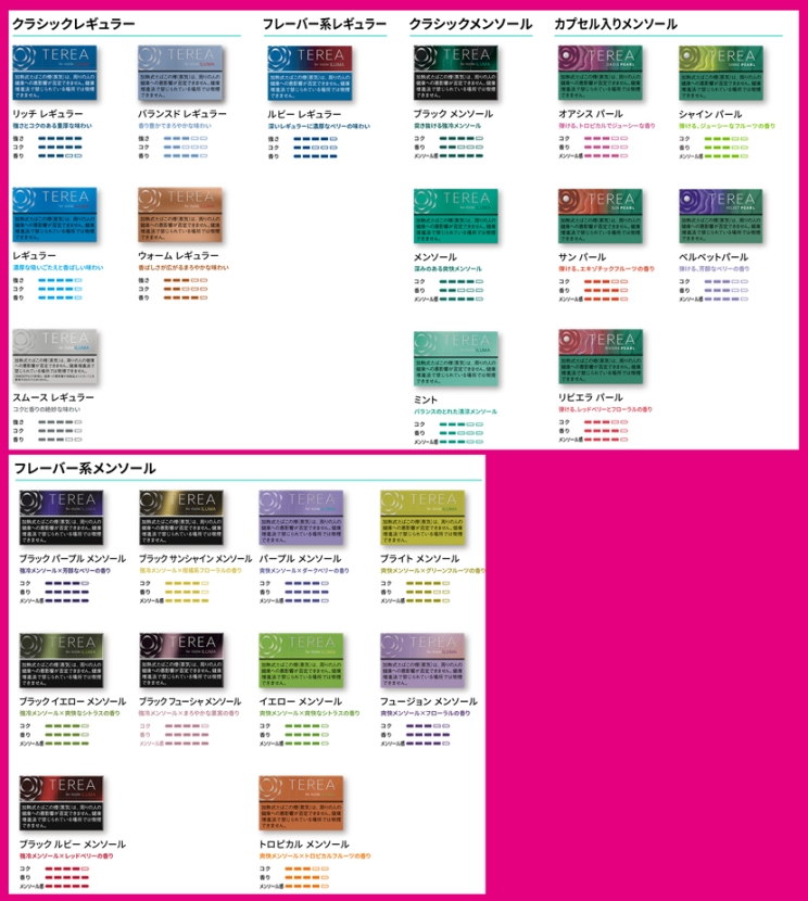 「アイコス イルマ」「アイコス イルマ i(アイ)」で使えるスティックはフラッグシップの「テリア」と廉価版の「センティア」の2種類。「テリア」の中でパール・シリーズとして展開しているのは、フィルター部分にカプセルを仕込んだカプセル・メンソールタイプの製品です。
