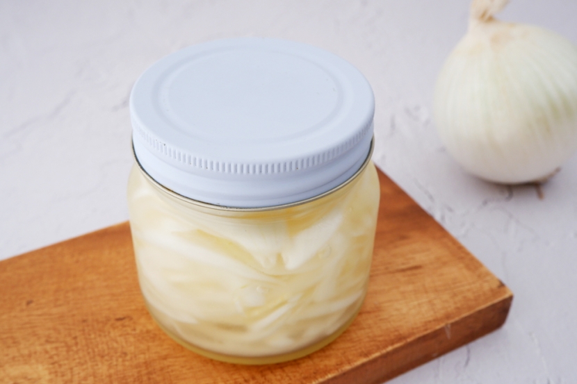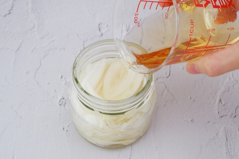 煮沸しておいたガラス瓶に入れ、玉ねぎが浸かるくらいまで酢を注ぎ入れましょう。