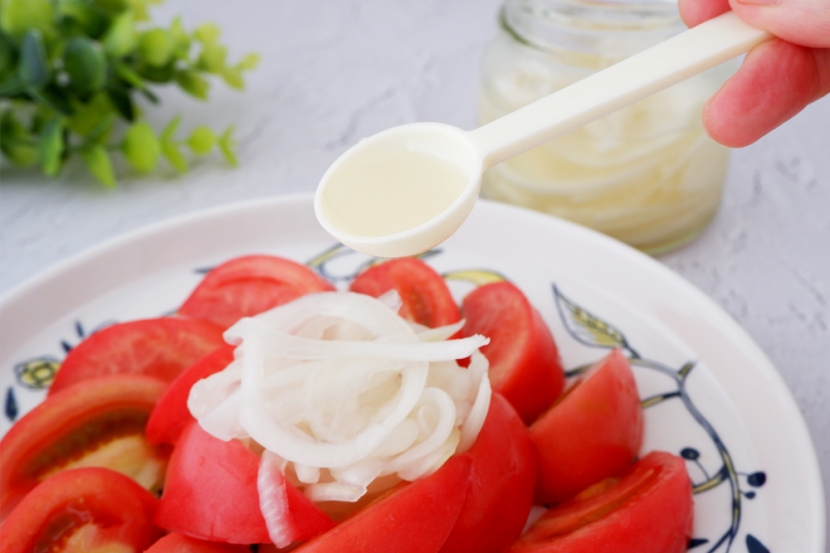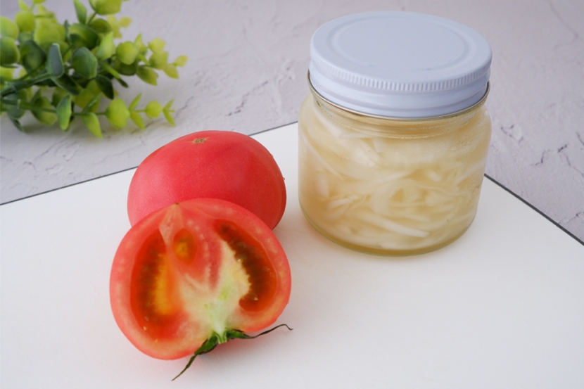 カットしたトマトと「酢タマネギ」を一緒に盛り付けるだけです。