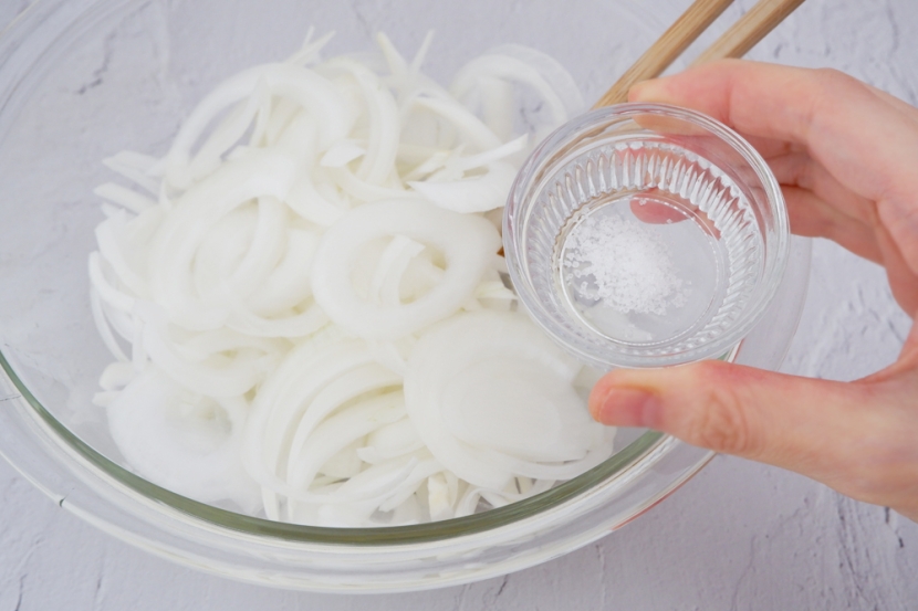 30分以上放置したら、塩を加えてよく混ぜ合わせます。塩をまぶすのは、玉ねぎに酢やハチミツを染み込ませやすくするためです。塩分が気になる人は省いても大丈夫です。