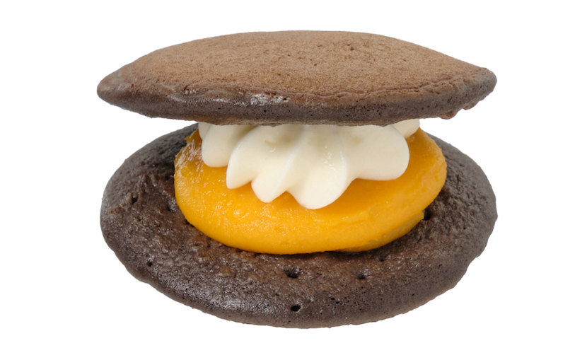 ココア風味のどら焼き生地に、北海道産かぼちゃペーストを使用した「かぼちゃあん」と、コクのある「マスカルポーネホイップ」をサンド。黒×オレンジのコントラストが映える、ビジュアルも楽しい和洋折衷スイーツ!
