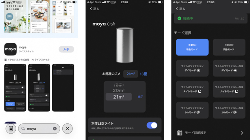 (写真左から)App Store(iOS) もしくはGoogle Play ストア(Android)から「moya」アプリをダウンロード/Bluetoothで『moya』と接続/さまざまなモードがすでに設定されているので選択して使う。