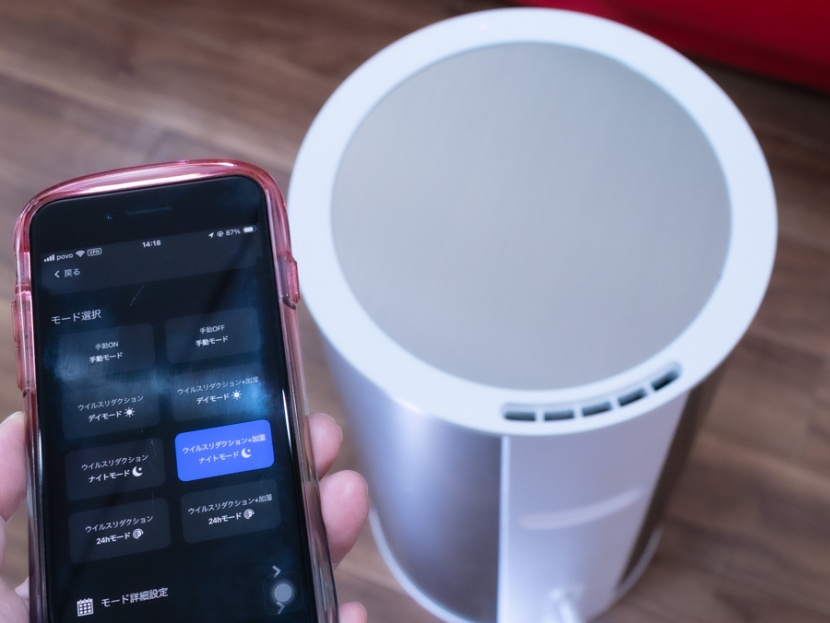 モードは大きく分けて2つ。「ウイルスリダクション(減少)」モードと「ウイルスリダクション(減少)+加湿」モード。その中から「ナイトモード」や「24hモード」などを選びます。アプリ操作自体はシンプルでわかりやすいと思います。わからなくなったら取扱説明書の役割も果たしてくれます。