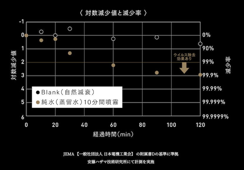 プルガティオとともに「moya」を生み出したのは、日本の大手建設会社を母体とする、安藤ハザマ技術研究所。空間除菌アロマスプレーの開発中、さまざまなオイルの効果を調べたとき、通常使う実験用の水道水を、誤って蒸留水を使用してしまったところ、空間のウィルスが激減。それが「純水ミストによる浮遊ウイルス減少の発見」につながり、純水の超微細ミストを放出して間浮遊ウイルスを99.9%不活性化させる「moya」が誕生したそうです。