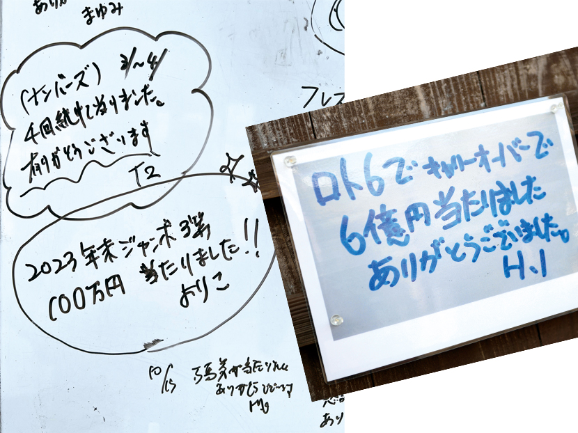 (写真左から)万馬券的中など、ギャンブル運も上がる。/6億円当せんのお礼参りの言葉。