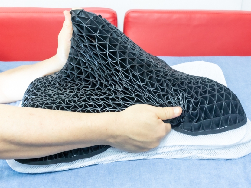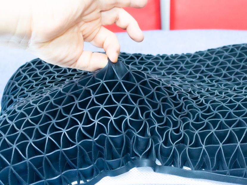 まず土台となるのが、TPE(熱可塑性エラストマー)素材を使った本体部分。TPEとはプラスチックの加工性とゴムの弾力を併せ持つ素材ですが、この製品のTPEは実にやわらかく、つきたてのお餅のような触り心地が特徴です。表面はウェーブ状になっており、頭部に触れる面積を最適化しています。