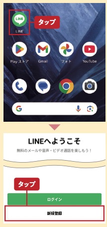 ①ホーム画面で「LINE」を聞く(ない場合は、Play ストアやApp Storeで入手する)。次に、「新規登録」をタップ。