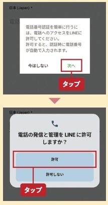 ②Androidでは、電話番号の認証を簡単にするための確認画面が表示される。「次へ」をタップし、電話の発信と管理を許可するか聞かれたら、「許可」をタップ。