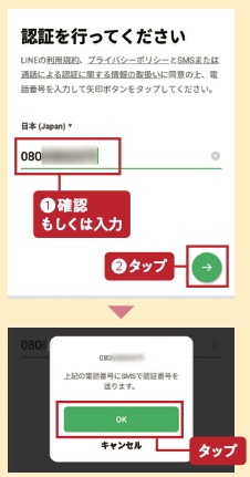 ③電話番号が自動で入力されるので確認。iPhoneは、スマホの電話番号を自分で入力する。「→」をタップして、次の確認画面で「OK」をタップ。