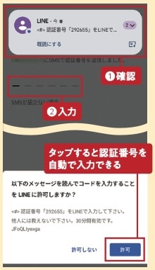 ④「メッセージ」アプリに認証番号が届くので確認してメモ。LINEの入力欄に、認証番号を入力する。Androidでは、「コードを入力することを許可しますか?」に対して「許可」をタップすると、番号が自動で入力される。
