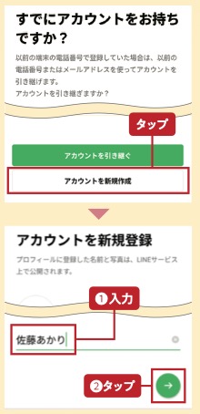 ⑤「アカウントを新規作成」をタップ。次の画面で、「名前」欄に自分の名前を入力して、「→」をタップする。