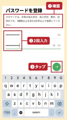 ⑥LINEのパスワードを登録する。まずは、画面の上に書かれたパスワードの条件を確認。条件を満たしたパスワードを考え、2回入力して「→」をタップ。このパスワードは、忘れないようにノートなどにメモしよう。