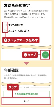 ⑦「友だち自動追加」と「友だちへの追加を許可」のチェックマークをタップして、白色の状態にする。「→」をタップ。「年齢確認」では「あとで」をタップする。