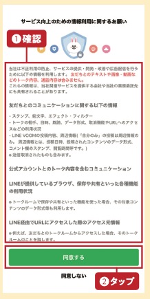 ⑧規約を確認して、「同意する」か「同意しない」のどちらかをタップ(同意しなくてもLINEは使える)。次の規約画面も下まで目を通し、「OK」をタップ。