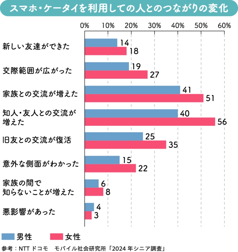 加えて、スマホには人と人をつなげる力もあります。NTTドコモが行った「2024年シニア調査」によれば、スマホを所有している60~80代男女のうち、女性の約5割、男性の約4割が「家族や知人・友人との交流が増えた」と回答しています。周囲の人とつながりがあると、災害や病気に備えやすくなりますし、孤立・孤独状態に陥るのも防げます。そういった意味でも、みなさんにはぜひスマホを使ってほしいのです。