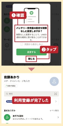 ⑩バッテリーの使用量の設定について聞かれたら、「閉じる」をタップ。通知などを許可するかどうかを自分で選んでいくと、LINEを使えるようになる。