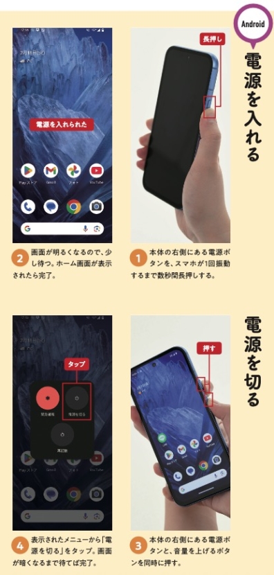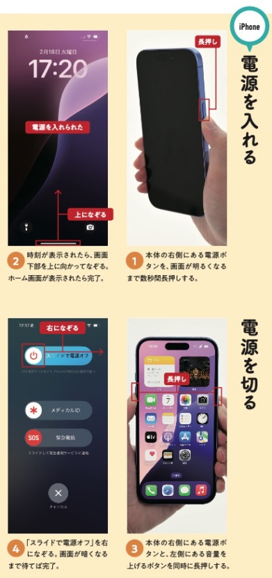 とはいえ、映画鑑賞や観劇の際は、一時的にスマホの電源をオフにする必要があります。手間取らずに電源のオン・オフを切り替えられるように、方法を覚えておきましょう。また、スマホの動作が遅いときに、電源を一度オフにし、その後、あらためてオンにすると、調子がよくなることもあります。