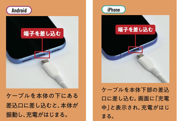 ステータスバー(ホーム画面上部右上の電池のかたちをした部分)を確認し、電池の残量が半分以下ほどになったら充電しよう。充電は、電源アダプタと付属のケーブルを使い、スマホをコンセントに接続して行う。電源アダプタは別売りになっていることが多いので、手元にあるか事前に確認しておこう。