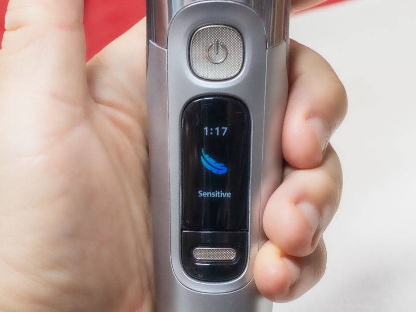 つまり鏡を見ながら緑をキープし続ければ、ヒリヒリしないのです。さらに今回初搭載された5つのシェービングモードから「センシティブ」を選べばより完璧。駆動音もやさしく、同じところを複数回滑らせてもヒリヒリしない肌弱男子にとっての快適なシェービングが可能でした。パワーは落ちているはずですが、切れ味自体が極端に落ちると言うこともなく、快適に剃れます。