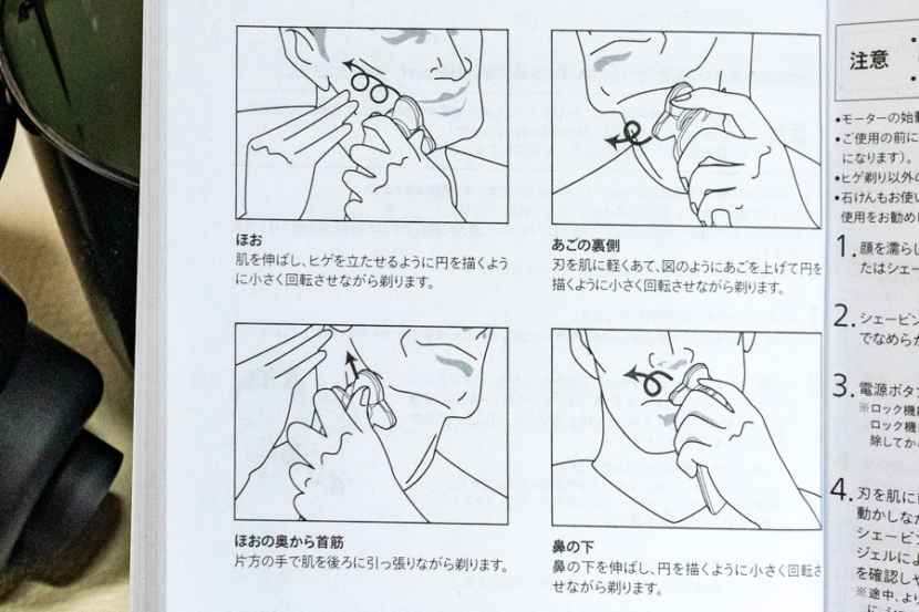 ドライ剃りは顔に皮脂があるとヘッドの滑りが悪くなるので、軽く洗顔するか、蒸しタオルで顔の皮脂を拭います(プレシェーブローションでも可)。いよいよ肌の下-0.08mmを可能にした「スーパーリフト&カット」に挑戦です。駆動音もおとなしく、凶暴感は感じません。