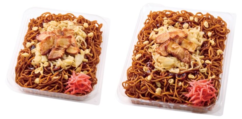従来品「大盛ソース焼そば」と比較して、麺重量を約50%増量。ジューシーでコクのある甘めのソースで炒めた焼そばだそう。麺たっぷり、がっつり食べられますね!