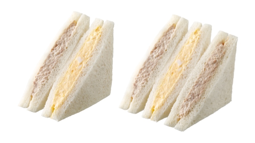 従来品「ツナたまごサンド」と比較して、ツナサラダを約50%増量。たまごサラダ、ツナサラダを、ふんわり食感の食パンで挟んだサンドイッチ。