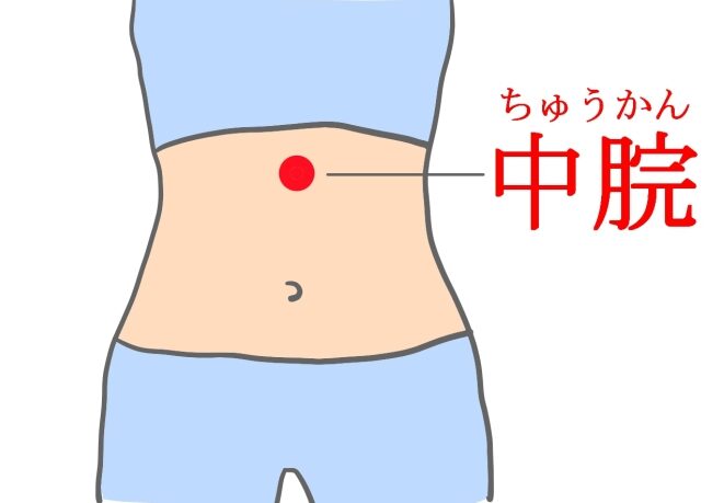 中脘は体の前面の正中線上の、みずおちとへその中間点にある、胃に関係の深いツボで、「胃の診断点」と呼ばれています。