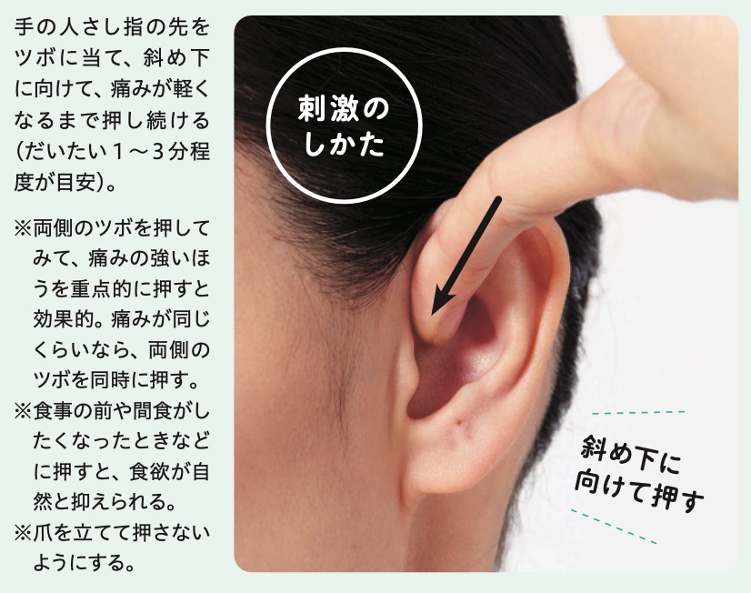 また、仕事中についおやつを食べてしまう人は、1時間おきに耳ツボを刺激すると、食べずに済みます。