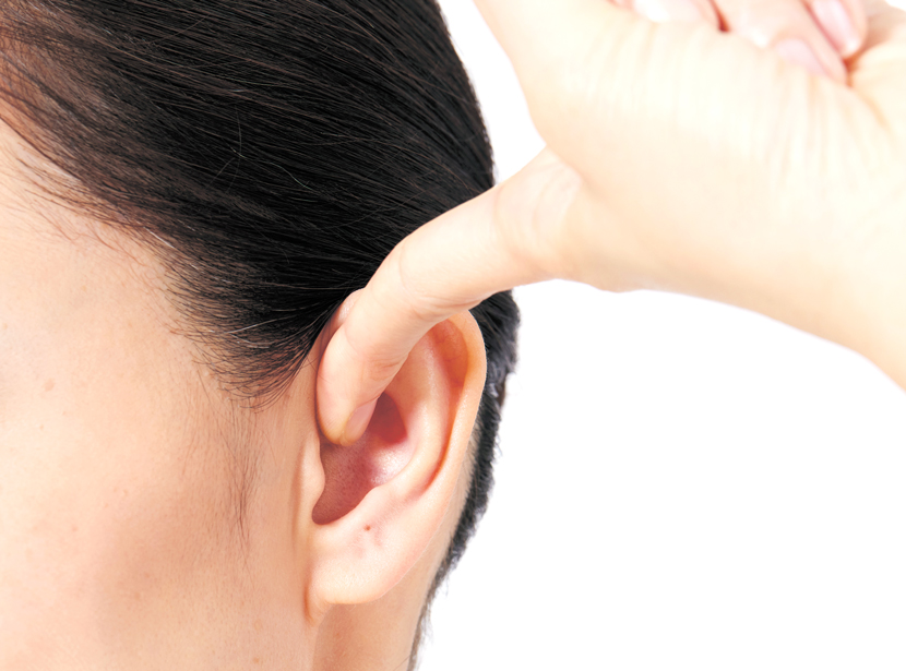 まずは、両耳のやせるツボに人さし指の先を当てて、斜め下に向けてぐっと押してみてください。痛さに左右差があることがわかるでしょう。
