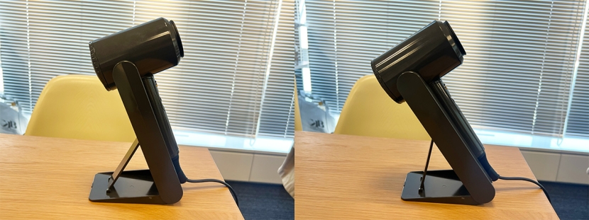 これは角度調節の一例。角度調整OKで狙ったところに風が当たります。スタンドは折りたたんで省スペース収納も。