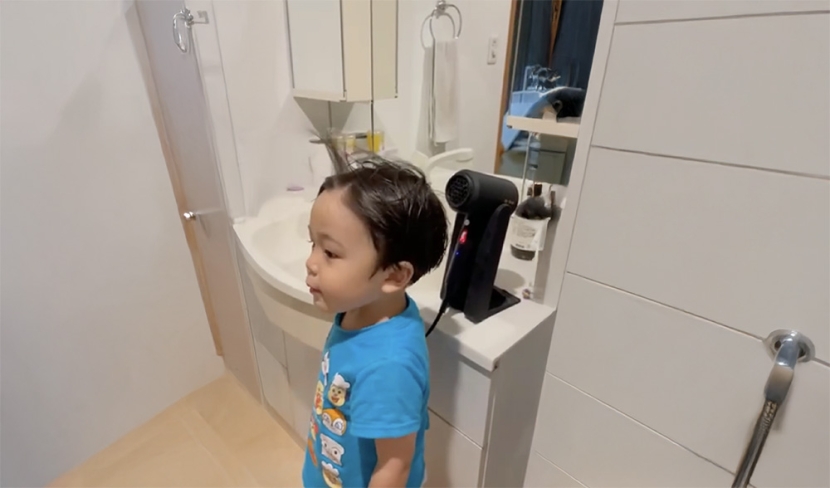 お子さんが回りながら髪の毛を自分で乾かしているシーン