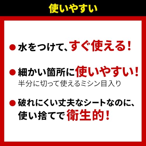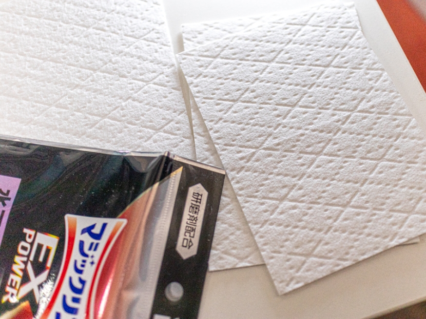 使い方は、シートを水で濡らし、汚れ部分をこするだけ。研磨剤が全体に染み出して汚れを削り取っていき、最後にクレンジング成分が残らないよう水でよく洗い流します。