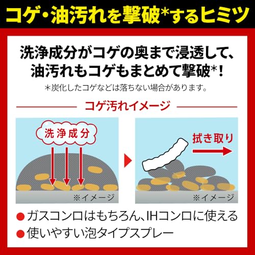 使い方は簡単で、汚れにスプレーし、ひどい汚れには約5分放置した後、布やスポンジでふき取り、水拭きで仕上げるという手順です。ガスコンロだけでなくIHコンロにも使用可。