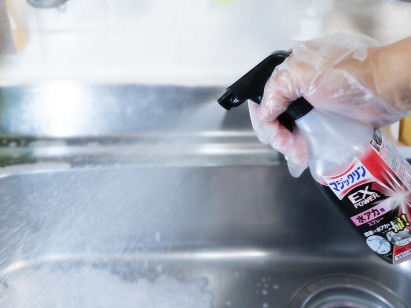 シンクのステンレスに浮かび上がる白いウロコにブシュッ。素材によってはシミや変色の恐れがあるため、目立たない場所で試してから使用することを推奨しています。