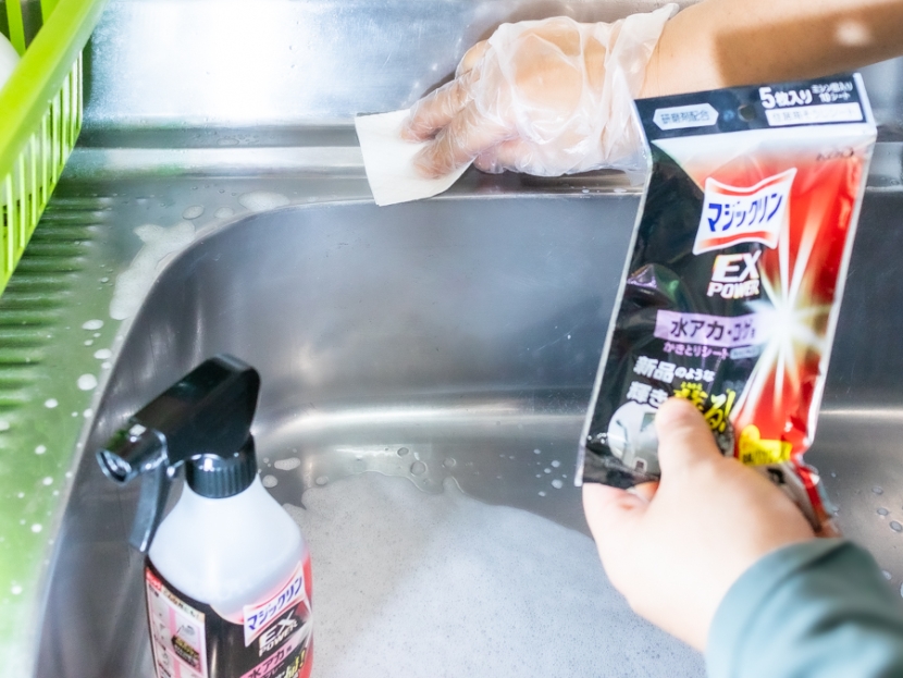 筆者は『マジックリン EXPOWER 水アカ用スプレー』と併用したら、やさしくこすっただけで水アカが落ちていくのが気持ちよかったです。他にも『こびりつき汚れ用つけおきパウダー』も併用可能です。