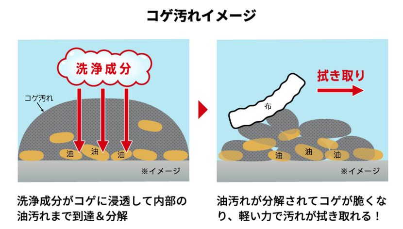 なぜかというと、花王独自の「変性油洗浄技術」を採用しているから。それはコゲの内部に潜む油汚れに着目し、油を変化させることで固着したコゲごと落とす仕組みになっており、コゲと油汚れに同時にアプローチできるのがポイント。
