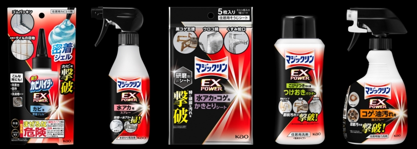 『マジックリン EXPOWER』シリーズのラインナップは、『マジックリン EXPOWER 水アカ用スプレー』『強力カビハイター EXPOWER カビ用密着ジェル』(一応、カビハイター EXPOWERですが、シリーズ扱い)『マジックリン EXPOWER 水アカ・コゲ用かきとりシート』『マジックリン EXPOWER こびりつき汚れ用つけおきパウダー』と、新製品『マジックリン EXPOWER コゲ・油汚れ用泡スプレー』の5種類。