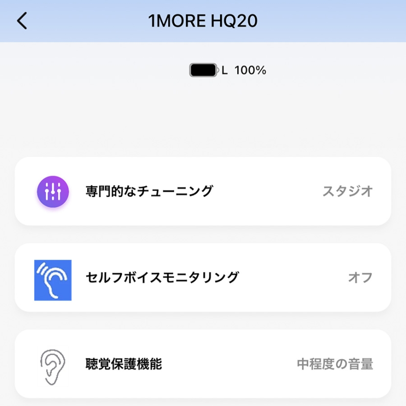 「HQ20」は専用アプリ「1MORE」で制御されており、3段階の音量制限がかかっています。高音量モードで最大95dB、中音量モードで最大85dB、低音量モードでは最大75dBまでしか、音が大きくならない設定です。