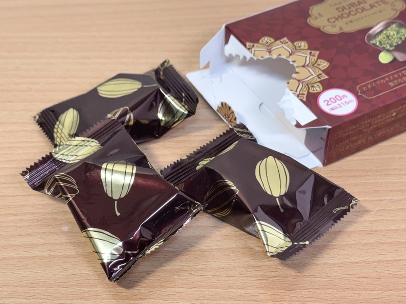 ダイソーの『ドバイチョコレート』は、3個入りで200円商品。お手頃価格とはいえ、お高めに感じてしまう。