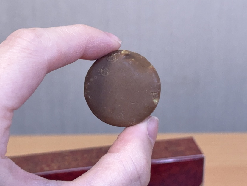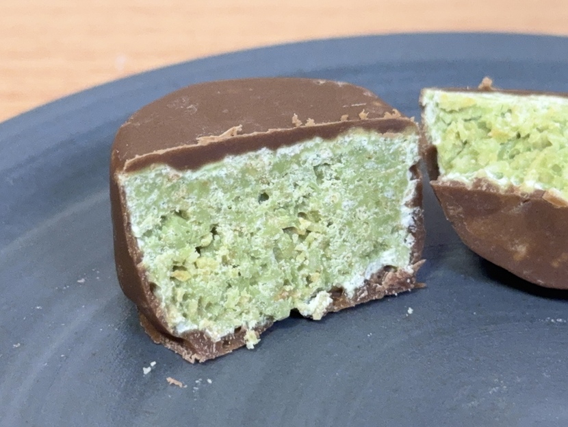 ひと口サイズで、中のピスタチオカラーが見え隠れするほどチョコは薄め。