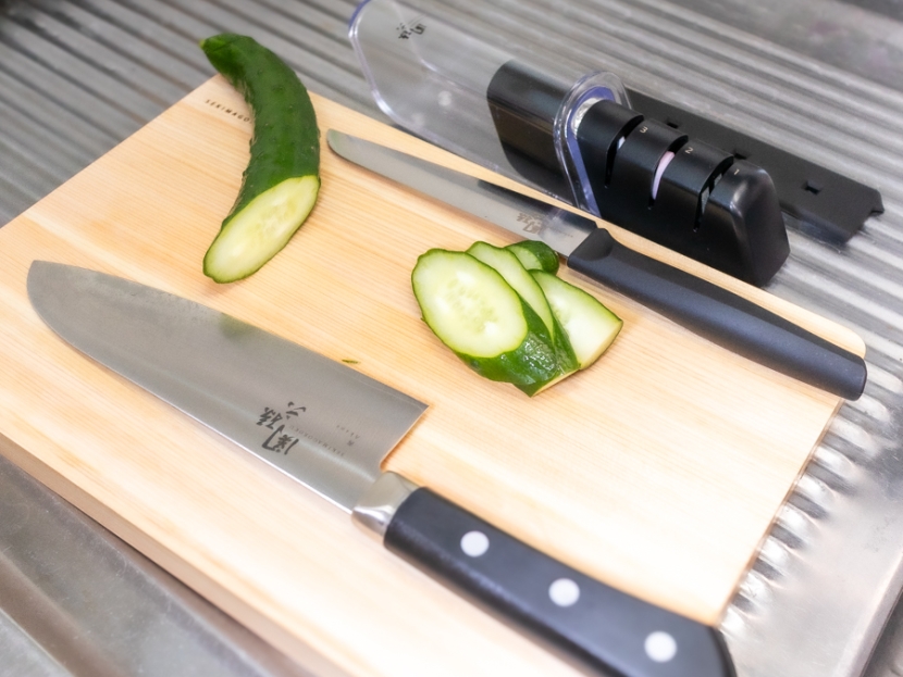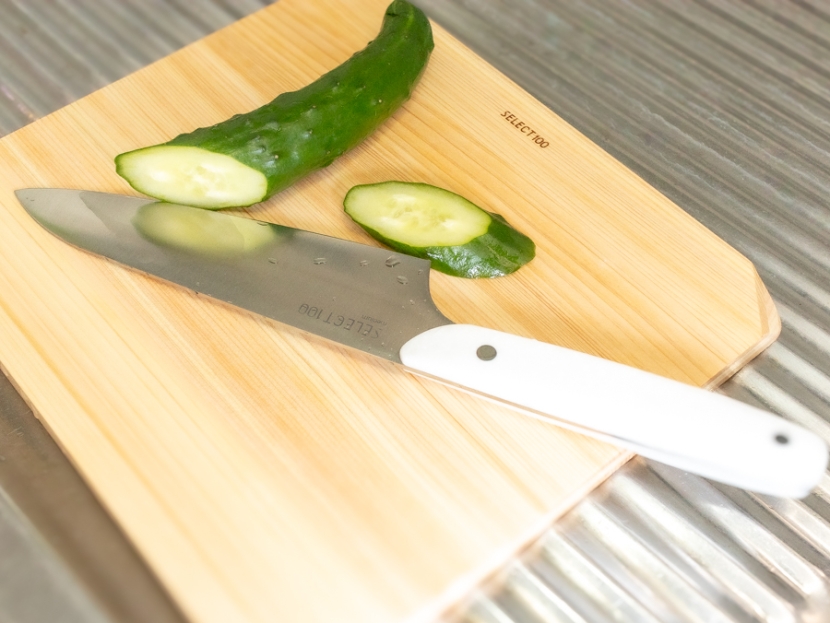 関孫六の三徳包丁できゅうりを切ってみると、スパッと切れる気持ちよさ! きゅうりの断面はみずみずしく、食べると口当たりがよくて美味しいです。吸い付くようにストレスなく切れて、驚きました。