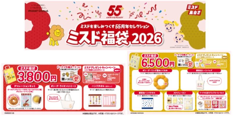 ミスタードーナツの『ミスド福袋2026』は税込3,800円と6,500円の2種類。3,800円はデコレーションキット、ポン・デ・ライオンミニトート、ハンドタオル2枚セット、ドーナツ引換カード20個分入りです。
