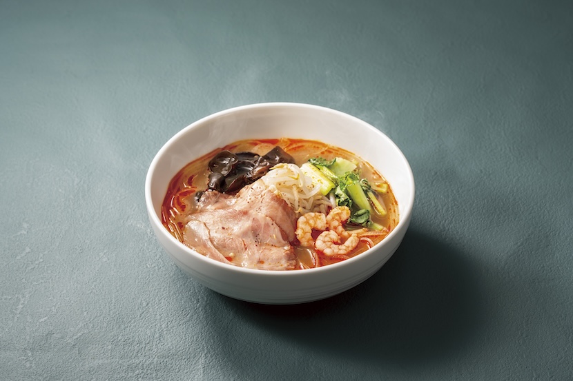 具材には、ローストポーク、海老、小松菜、もやし、きくらげ、香りのアクセント・パクチー(別添)という多彩で食感も楽しい食材が組み合わされています。麺は、もちもちとした食感と満足感が特長の「マロニー」と、「中華麺」から選べるのもうれしいポイントです。